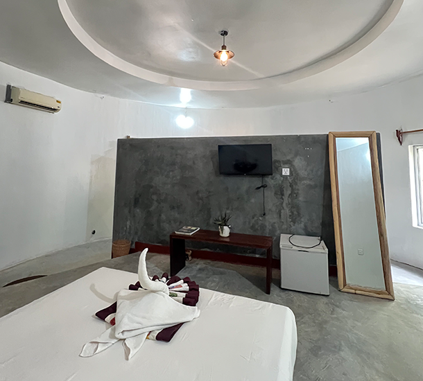 The highlight of this space is the no-roof bathroom, featuring a completely private outdoor shower. Immerse yourself in the natural world as you bathe under the open sky, surrounded by lush greenery and the gentle sounds of birds.
