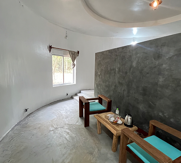 The forest floor of earth and scattered leaves adds to the feeling of seclusion, creating a serene retreat where natural beauty and quiet moments converge. This room is ideal for anyone seeking a peaceful eco stay surrounded by trees and fresh air.